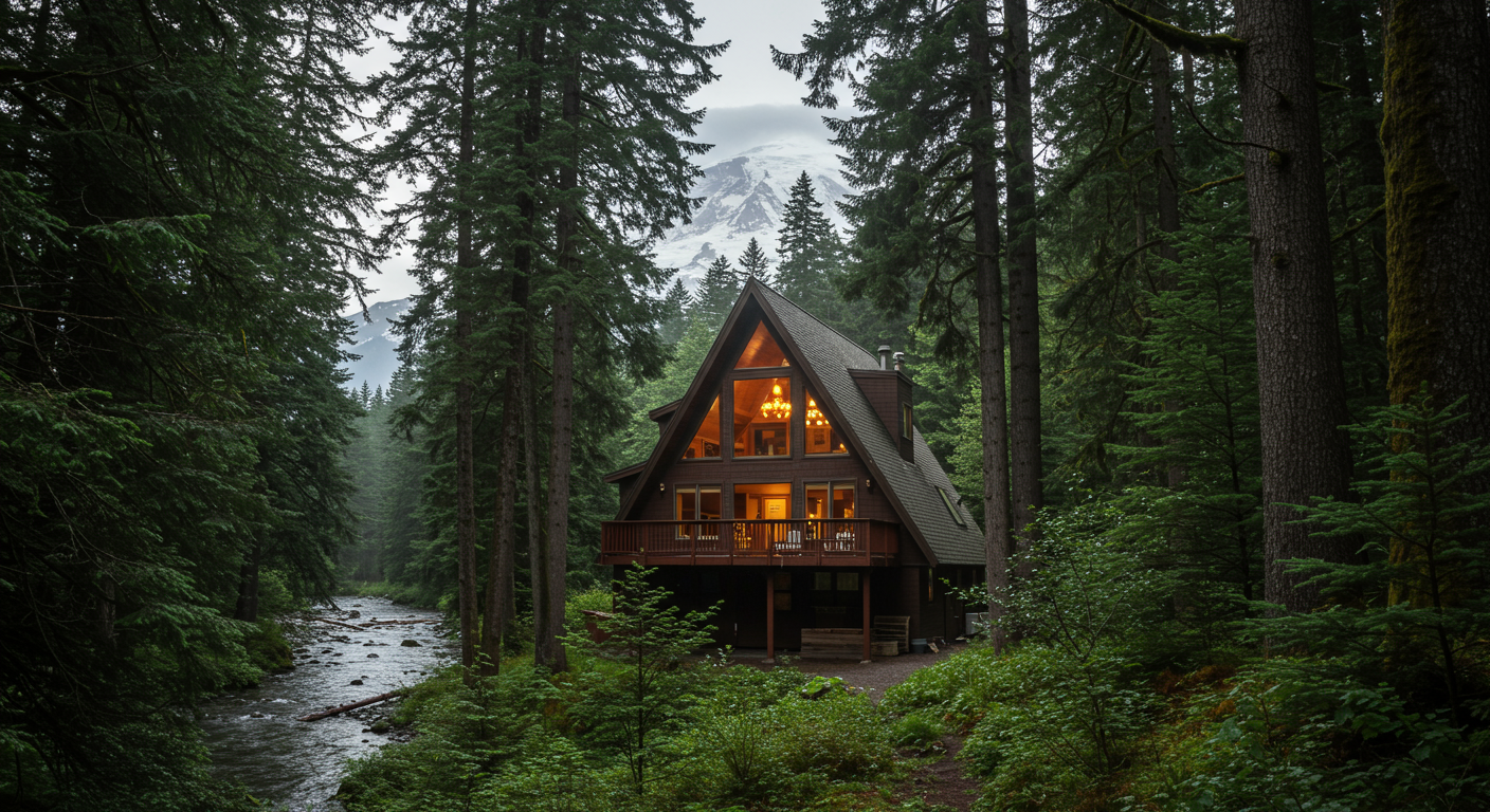 For a trip to Mount Rainier National Park in Washington, this quaint A-frame in the woods is an ideal choice. With a woodstove for warming up after a hike and a quick walk to a river, it’s a perfect point for relaxation.